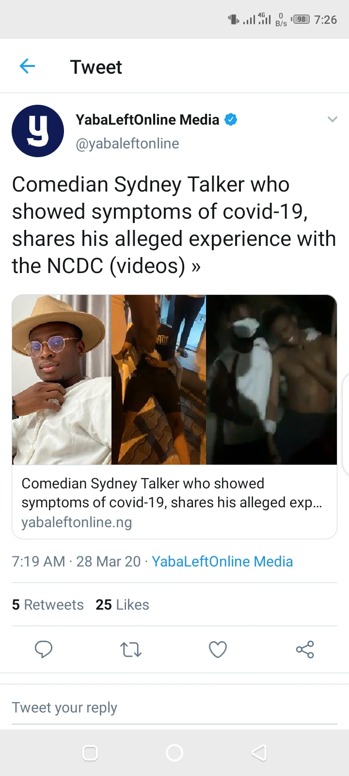 Famous Nigerian Comedian Sydney Talker has been showing symptoms of covid-19 virus for the past few days.