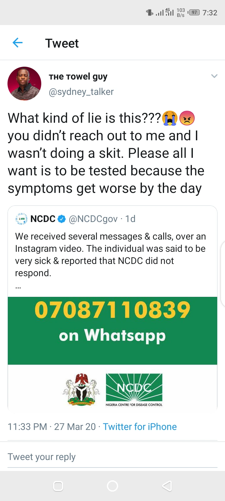 You didn't reach out to me And I wasn't doing a skit. Please all I want is to be tested Because the symptoms gets worse by the day."