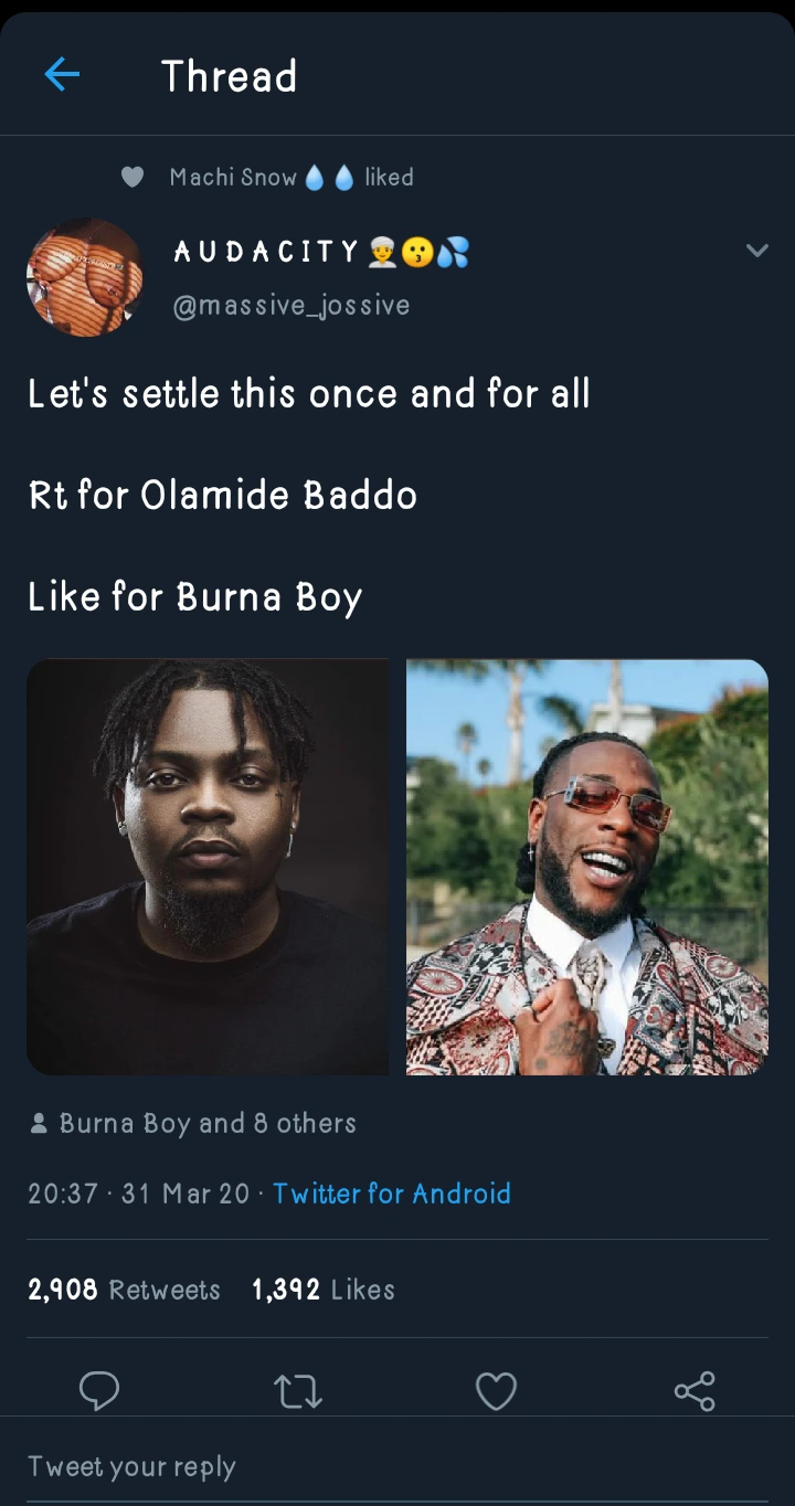 A pool was conducted on popular social media platform, Twitter, by a user who shared a tweet with the caption "Let's settle this once and for all. Rt for Olamide Baddo, Like for Burna Boy."