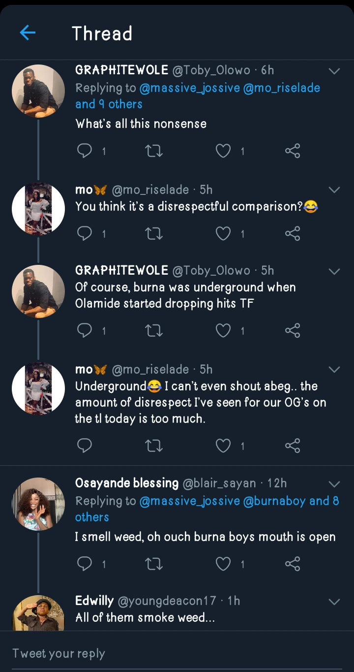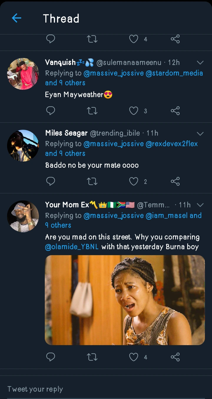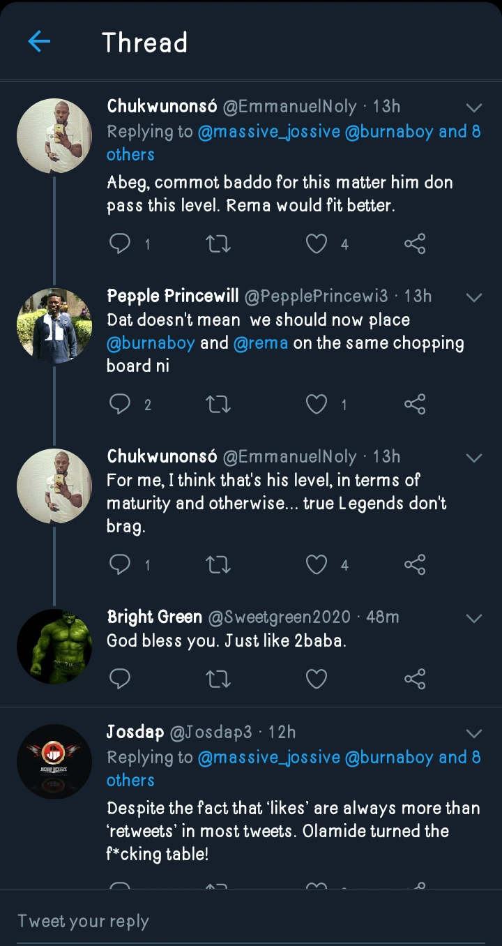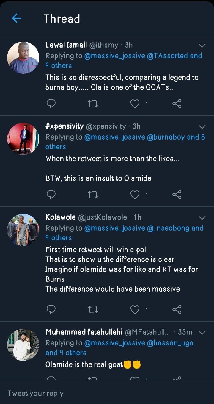 Others are of the opinion that Olamide is way better than Burna Boy and shouldn't be compared with the latter. With some claiming that it's disrespectful to compare both artist.
